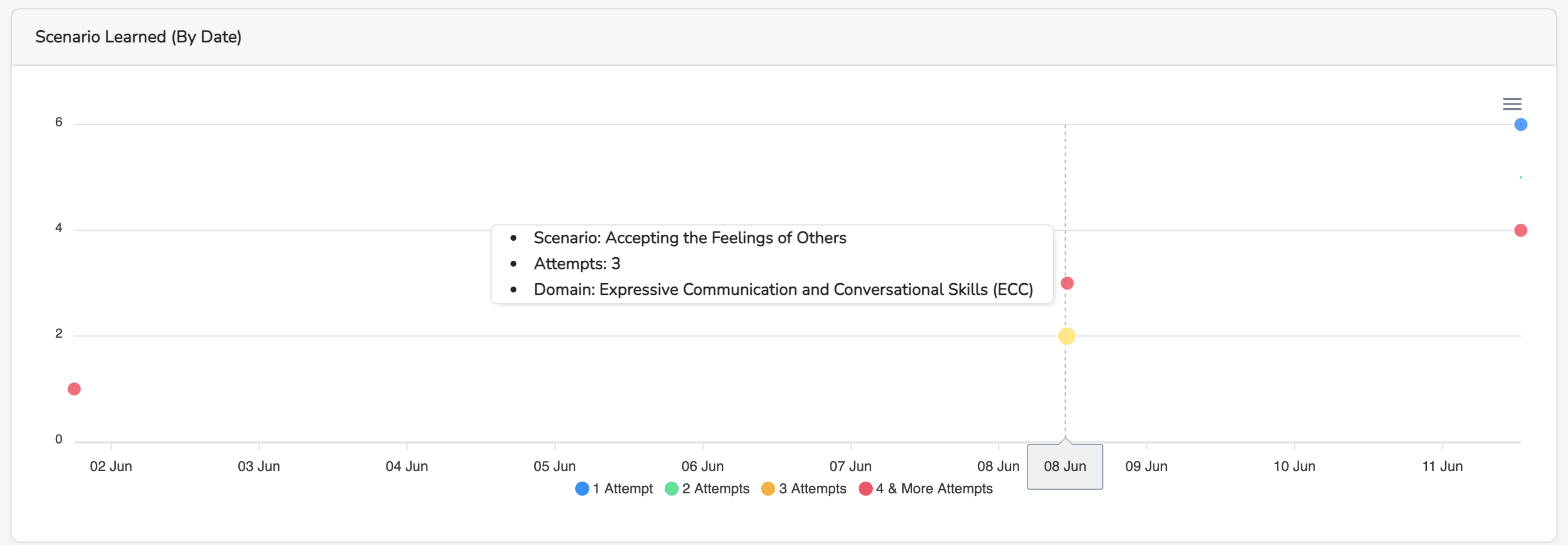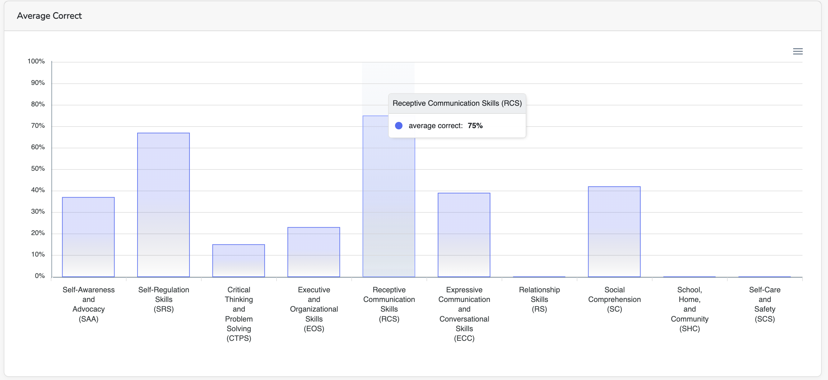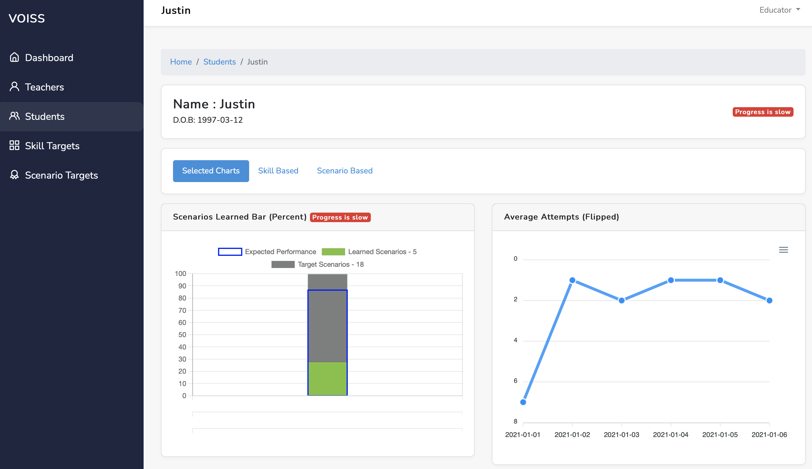 The VOISS Advisor Progress Monitoring tool is the teacher’s portal into student VOISS virtual reality progress and skill attainment. Teachers can see which of the social skill domains and skills are being learned and practiced, how fast the student is moving through, how accurate their responses are, how many attempts they need to complete each scenario and how their progress matches up to the expectation the teacher established for progress to be made.